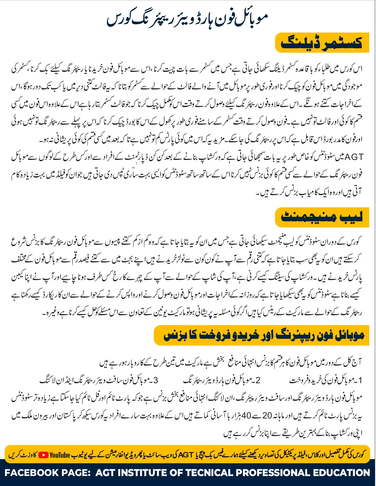 You may get all the information regarding this course through our website, here is the link: http://agtpk.com/courses/Mobile-Phone-Repairing-course-Muhammad Umair Ansari --25, May/ 2016