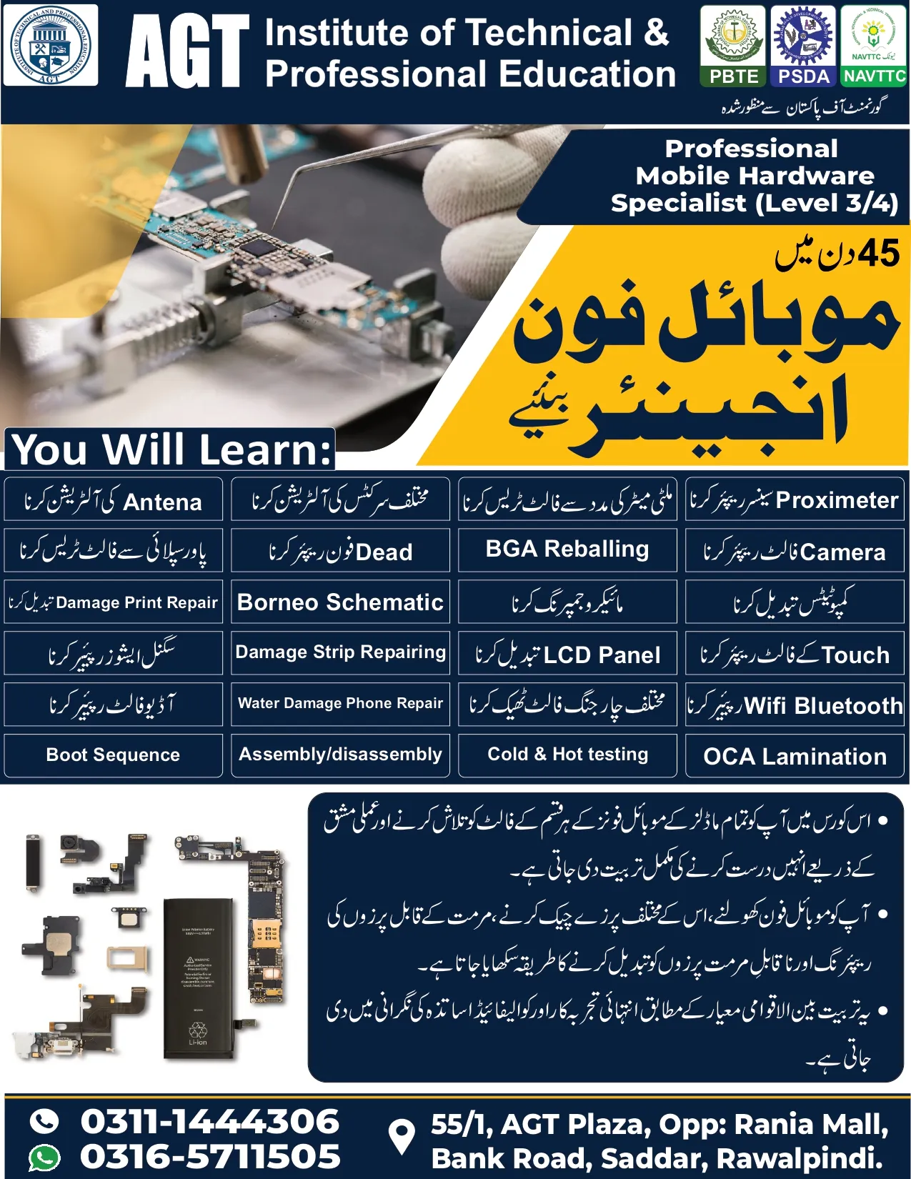 AGT Institute of Technical & Professional Education offers a comprehensive training program in Mobile Phone Hardware Repairing, including:
