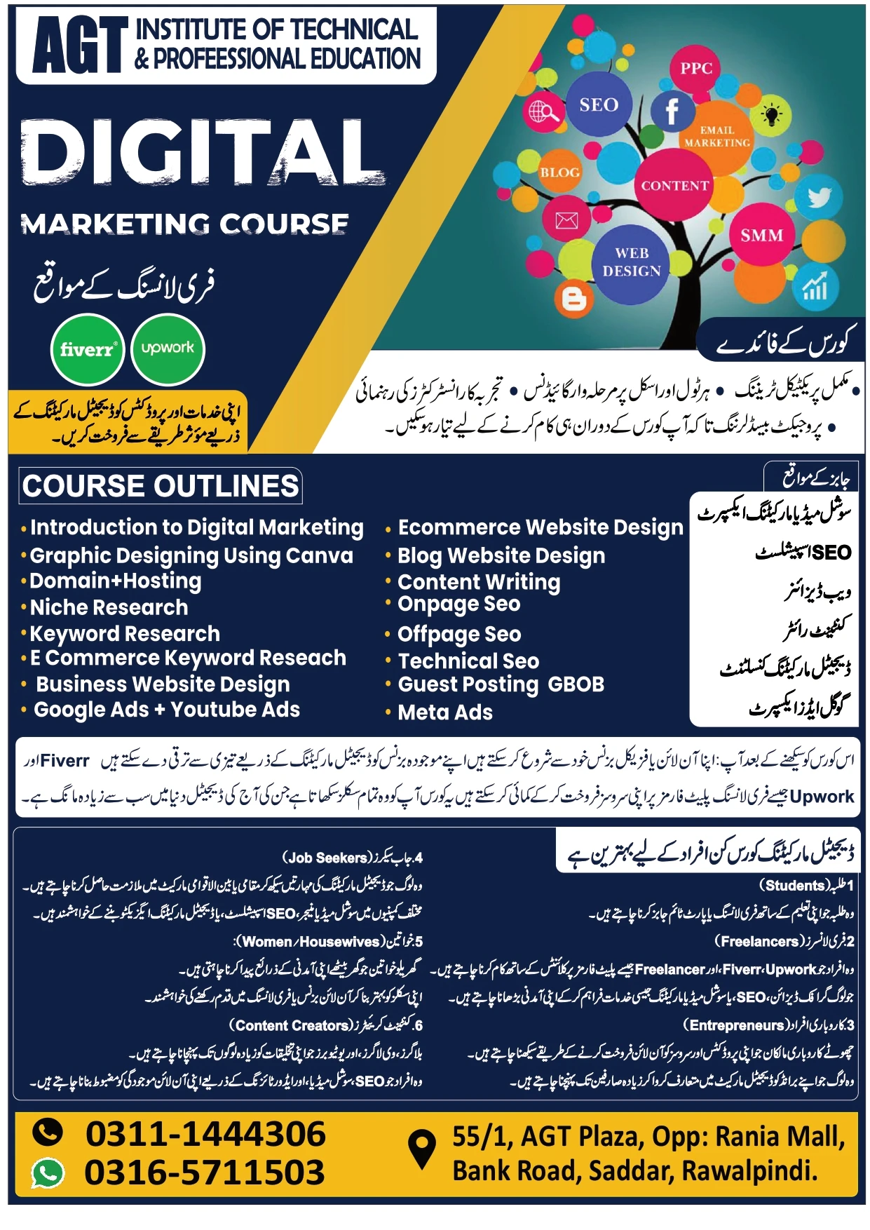 AGT se rabta karne ka shukria idarey mein digital marketing ka course mukamal practical guarantee kay sath karwaya jata hai, ap idara visit kijiye location opposite Rania Mall Bank road saddar rawalpindi, 1 din ki free trial class lijiye mutmaeen honay per admission lijiye regular fee 32000 hai abhi ramzan offer hai jis mein heavy discounts diye ja rahey hein apkay diye gaye number per hamara numainda mukamal tafseelat kay sath rabtay mein hai check whats app or contact us 03111444306,whats a