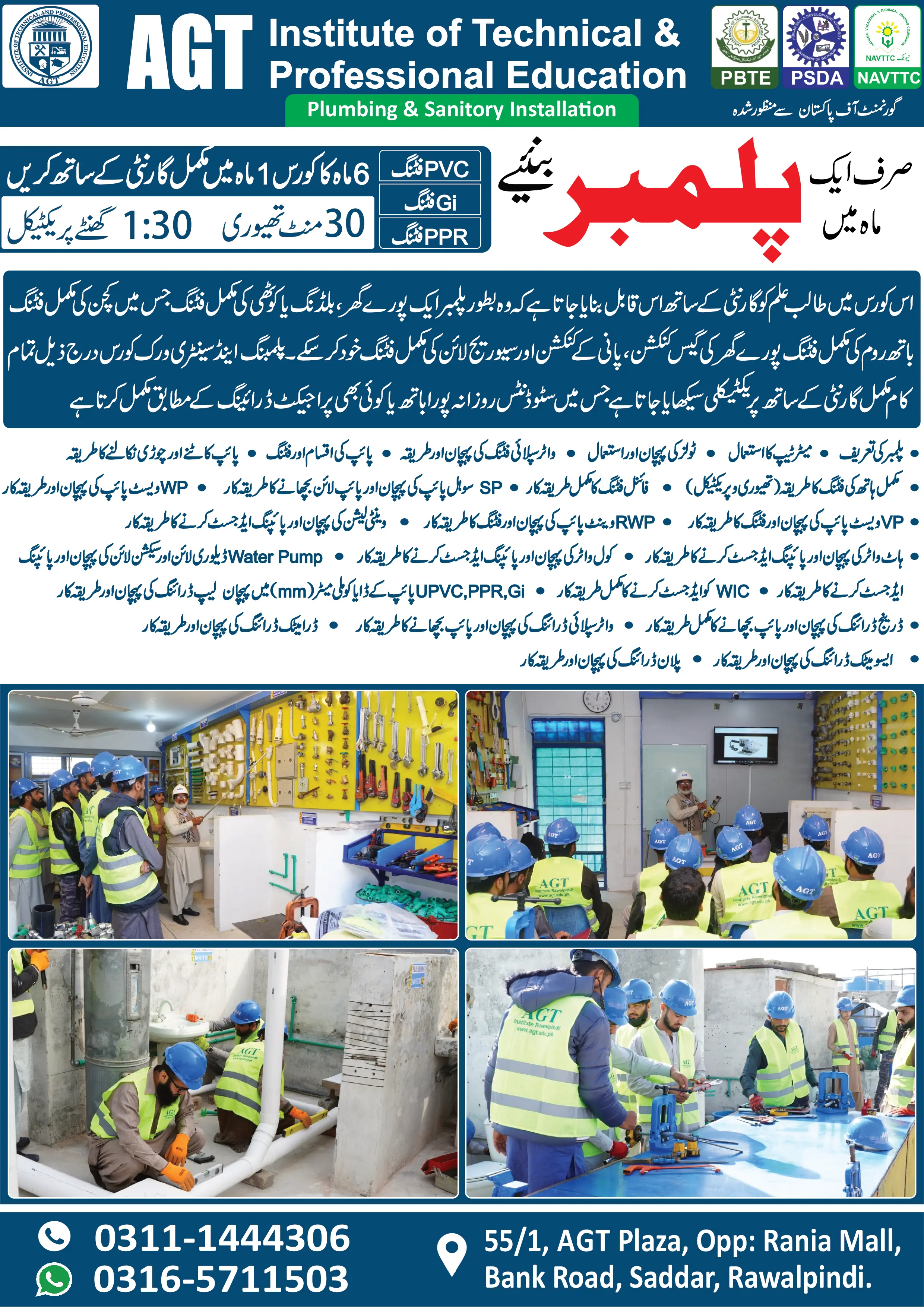 AoA AGT institute sy rabta krny ka shukriya. G sir plumbing and sanitary installation course mein admission open hain. Mazeed maloomat k lie 03111444306 pr rabta kr skty hain.